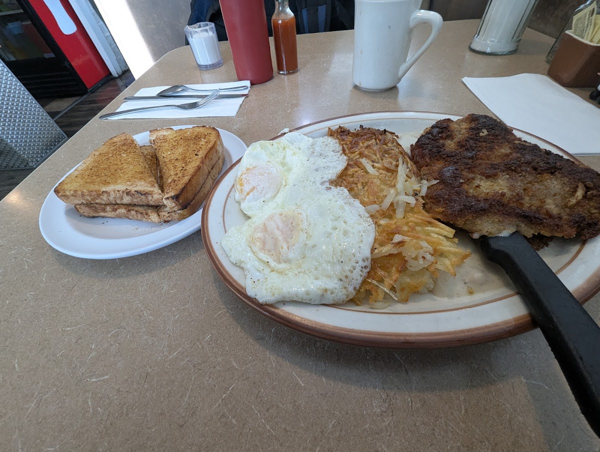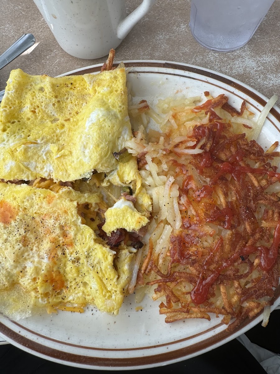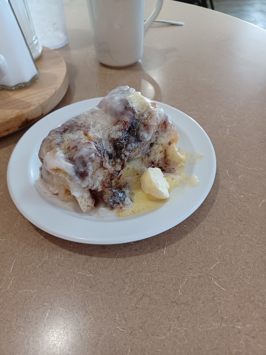Love the small diner feel. Egg omelet and hash browns were delish. My husband ordered the steak and eggs, he mentioned that it was undercooked a little. Cinnamon rolls are yummy also and the pebble ice is amazing! Will be returning.